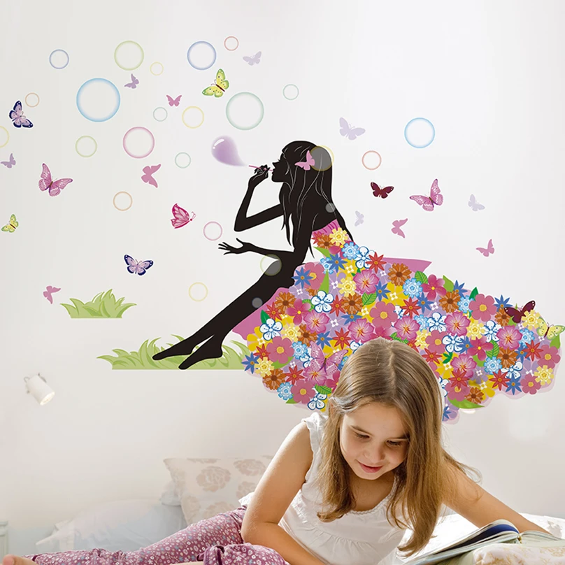 BEST QUALITY Pricuitie Fairy Girl Wall Stickers Vinyl DIY Butterflies Bubbles Mural Decals for Kids Room Baby Be