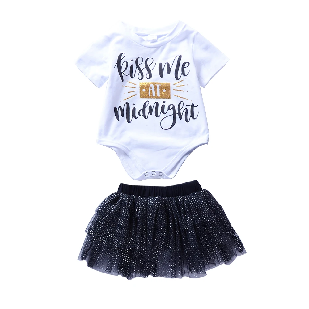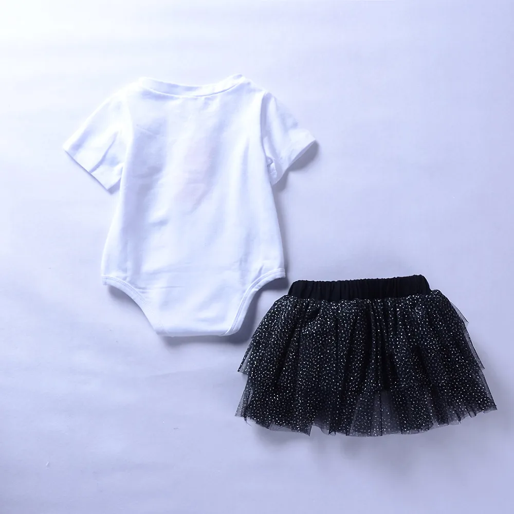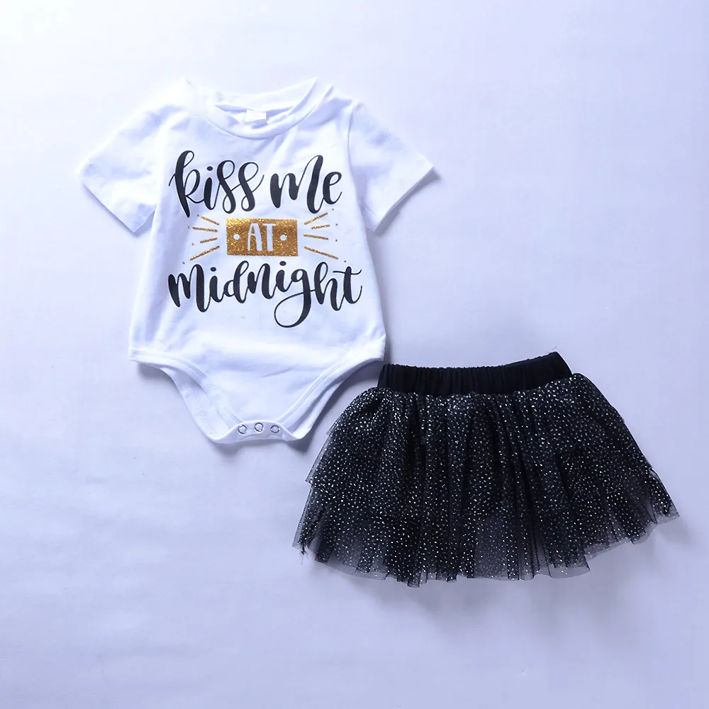 Infant Baby Chidlren Girls Clothes Suits White Tops Kiss ME Romper+Black Dot Skirt Bebe Kids Girls